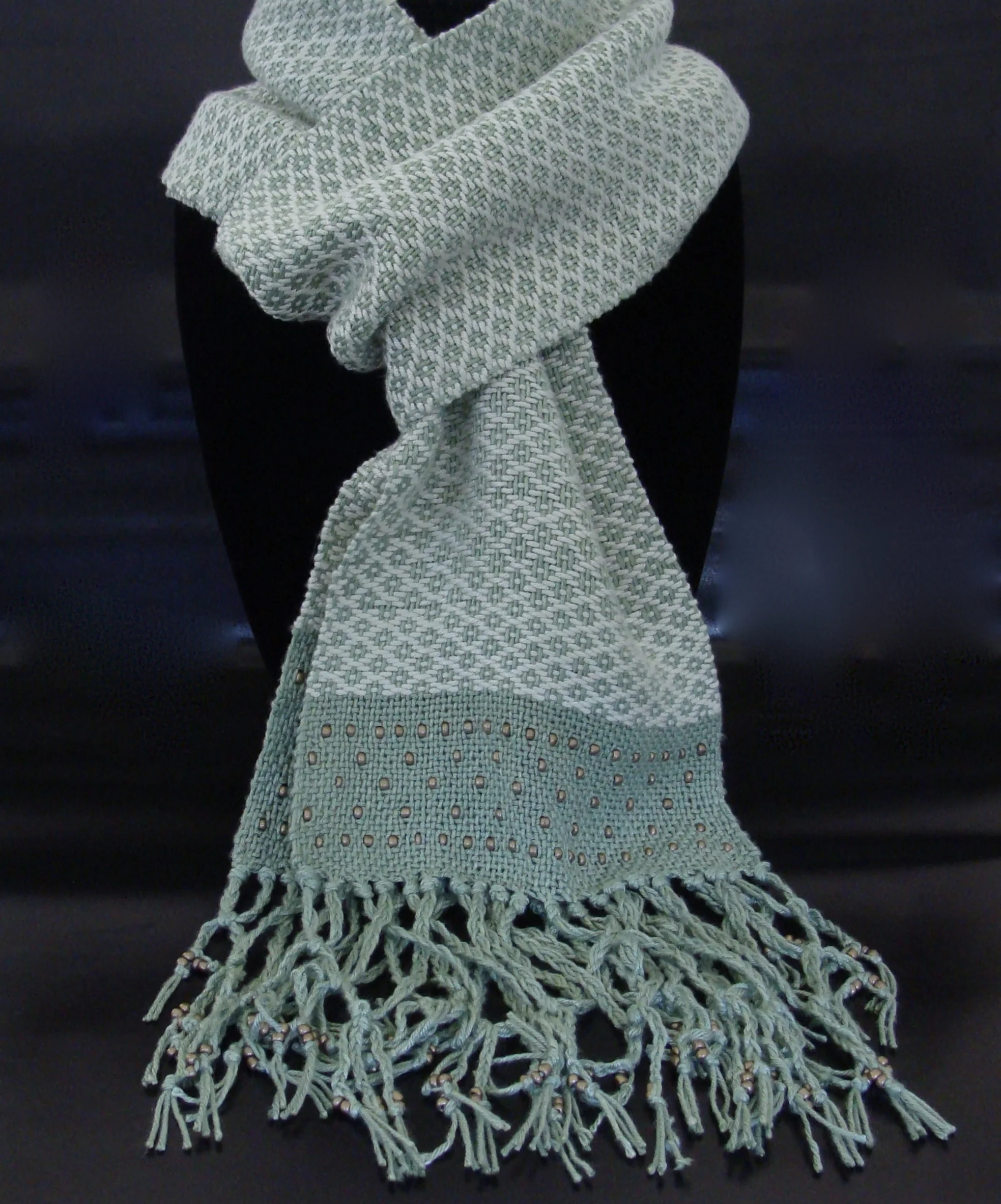 In addition to adding beads to the fringe, there is beadwork woven into each border of the scarf. The beads are threaded onto the weft yarn, then placed into position between appropriate warp threads as those picks are thrown.